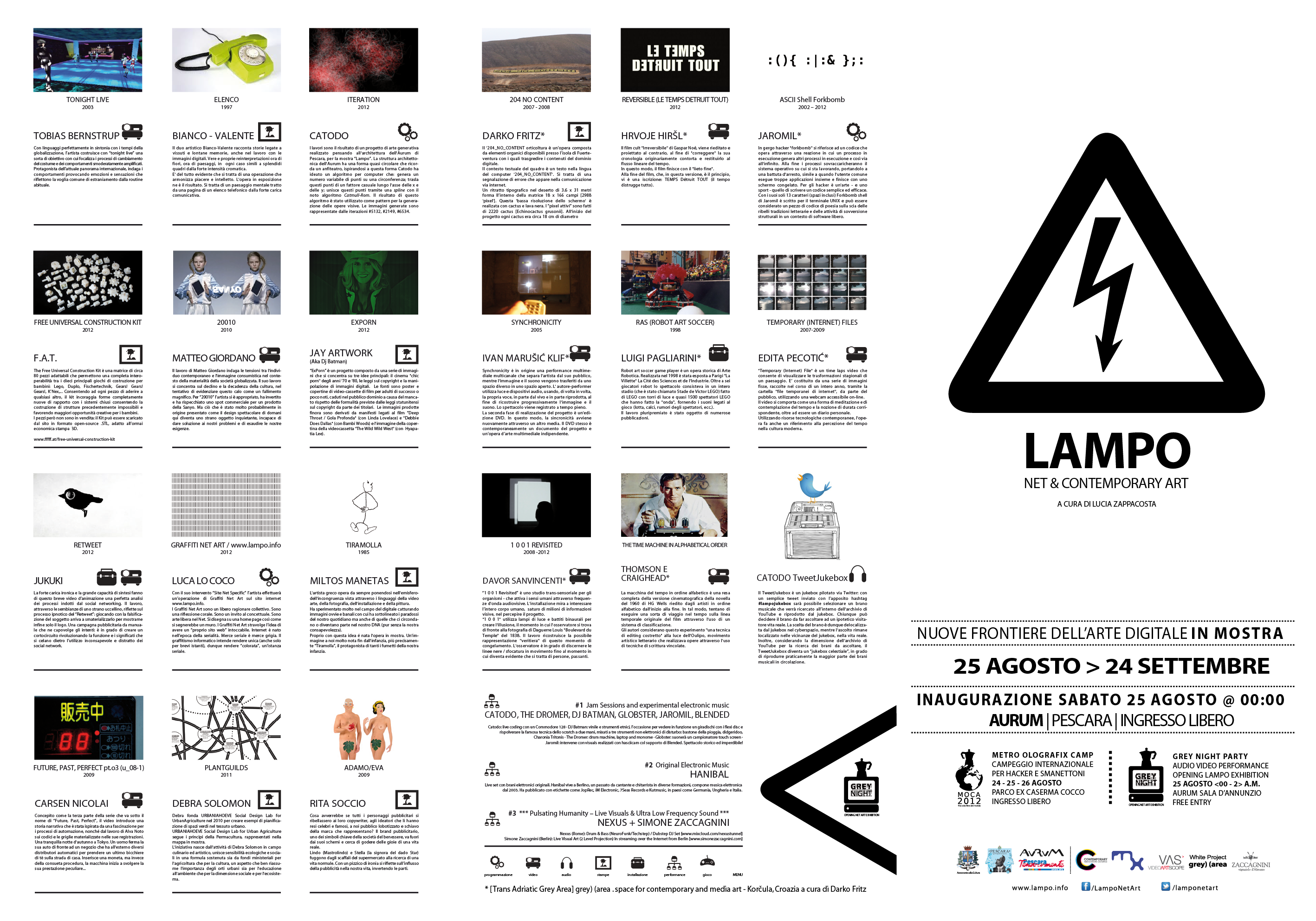 La mostra sarà inaugurata sabato 25 Agosto alle 23.59 presso la Sala d’Annunzio dell’Aurum di Pescara con la Grey Night una 2 ore di performances Audio Video Live con artisti internazionali presenti in città grazie al MOCA2012, campeggio internazionale di hacker e con collegamenti streaming in vari luoghi d’europa.